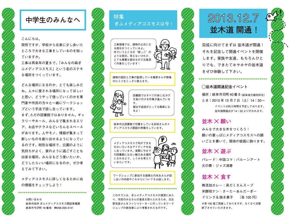 並木道を連想させるフレッシュな緑とせせらぎの水色を使って、レイアウトしています。